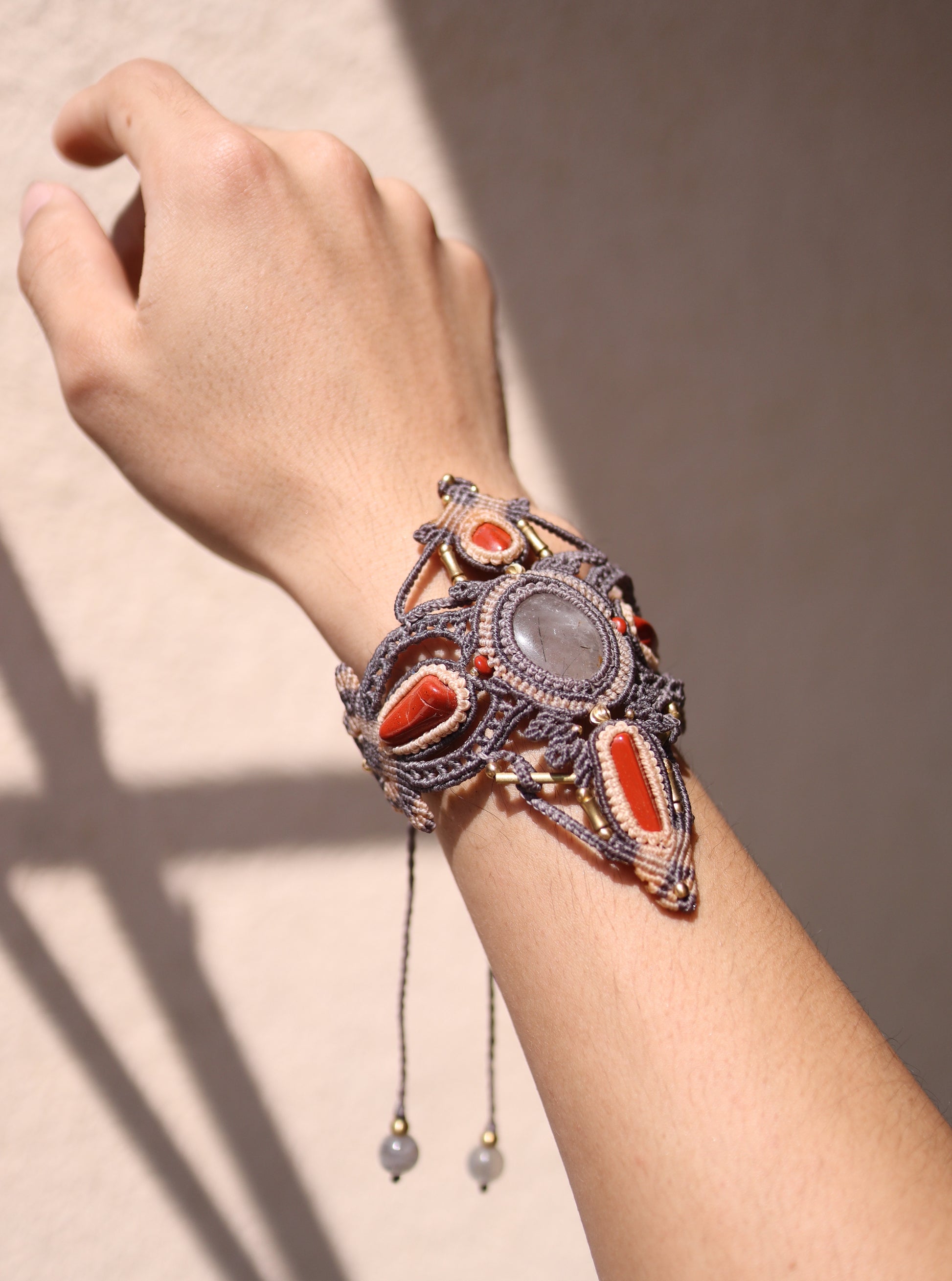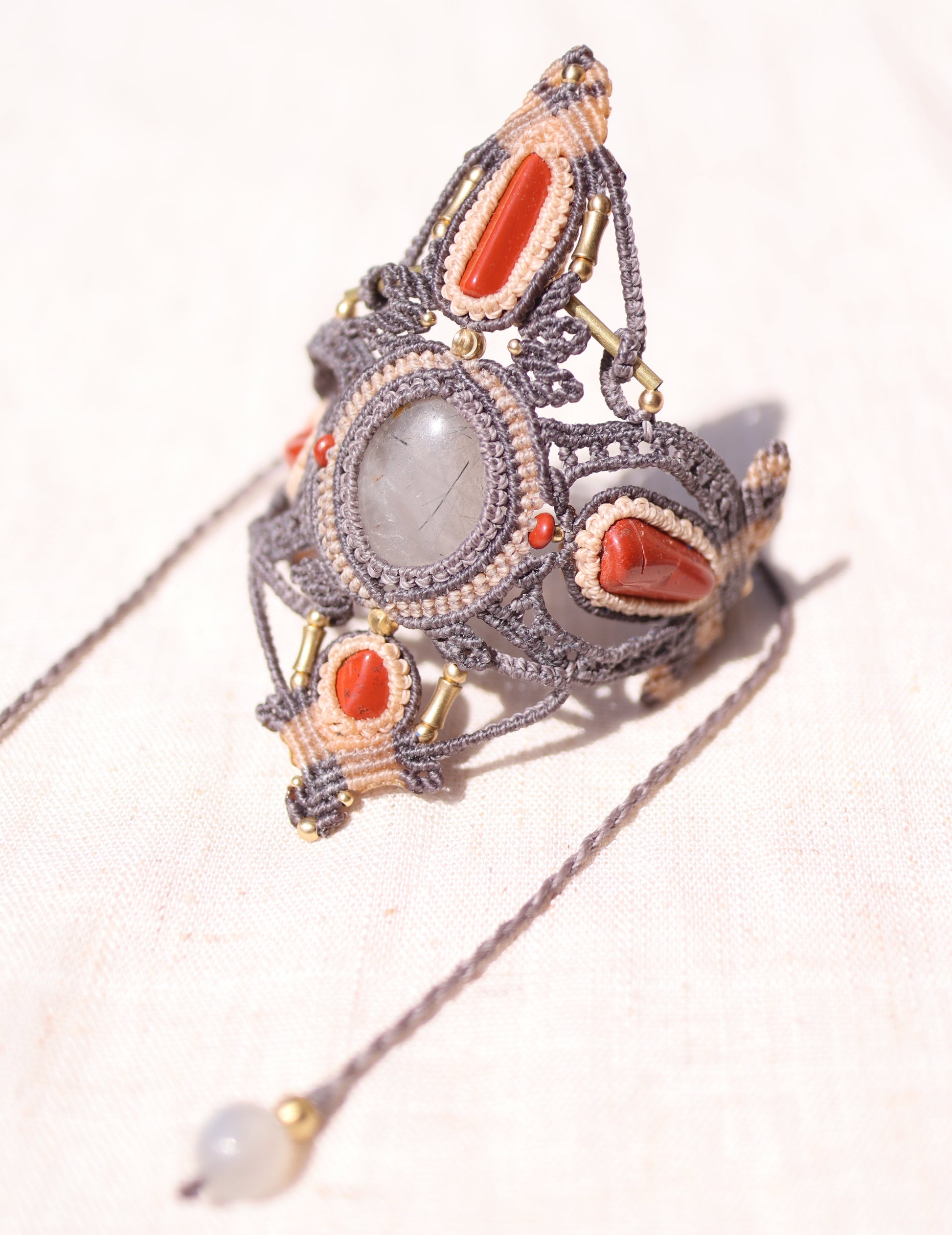 When the sacred incantation is spoken, Red Jasper, Clear Quartz, and Black Rutilated Quartz unite as the triad of Martial Spirit—will, ability, and means.